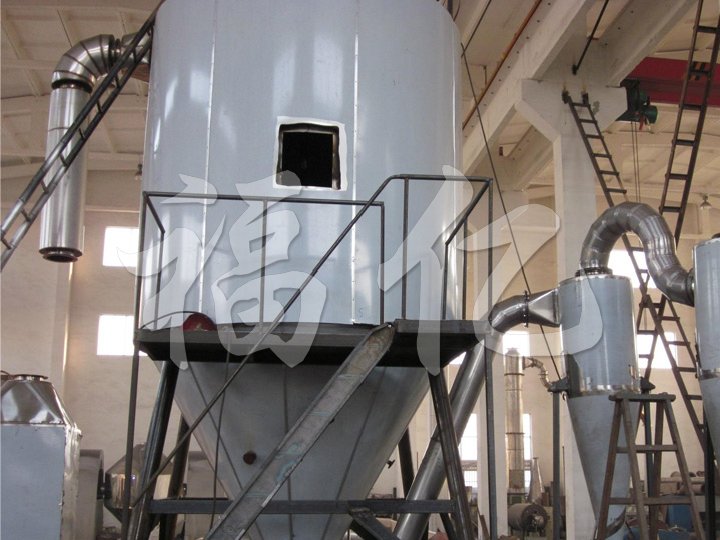 空氣經(jīng)過濾和加熱,進入干燥器頂部空氣分配器,熱空氣呈螺旋狀均勻地進入干燥室。料液經(jīng)塔體頂部的高速離心霧化器,(旋轉(zhuǎn))噴霧成極細(xì)微的霧狀液珠,與熱空氣并流接觸在極短的時間內(nèi)可干燥為成品。成品連續(xù)地由干燥塔底部和旋風(fēng)分離器中輸出,廢氣由風(fēng)機排空。